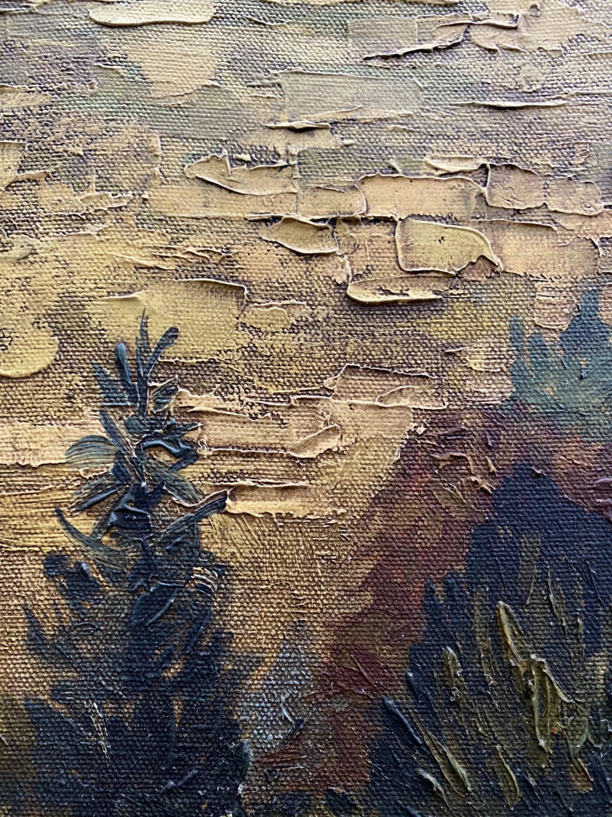 ransportez-vous au cœur de la nature avec cette œuvre envoûtante. Les tons chauds et la texture riche de cette peinture évoquent la sérénité d'un paysage champêtre baigné de lumière dorée. Offrez-vous un moment de paix et de contemplation, une échappée dans un univers paisible et enchanteur.