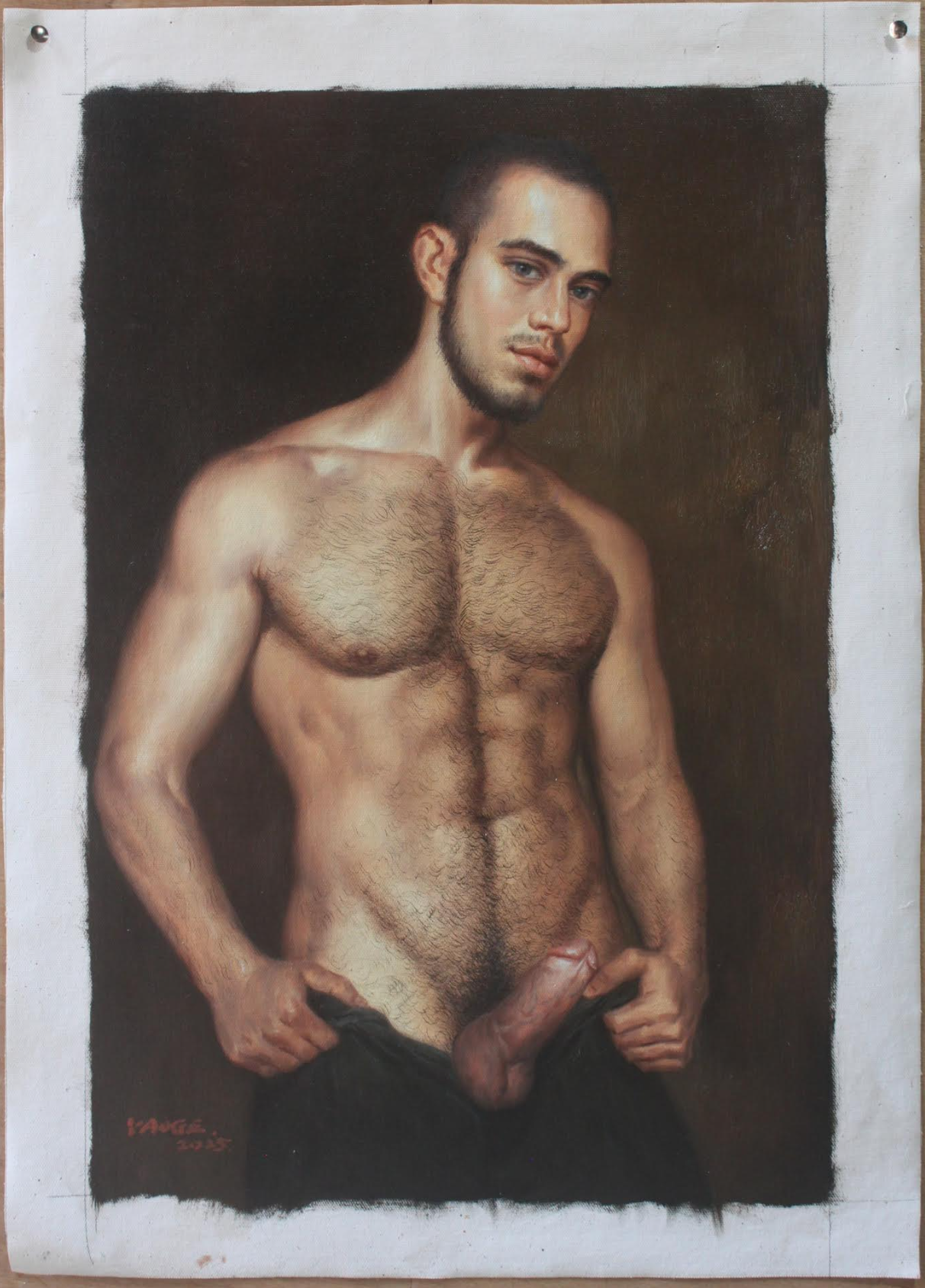 peinture à l'huile réaliste d'un jeune homme torse nu. Il est représenté de la taille jusqu'au haut du corps, légèrement de profil, le regard dirigé vers le spectateur. Son corps est musclé et velu, et il tient son pantalon légèrement baissé, révélant son sexe. Le fond est sombre et neutre, mettant en valeur le sujet principal.