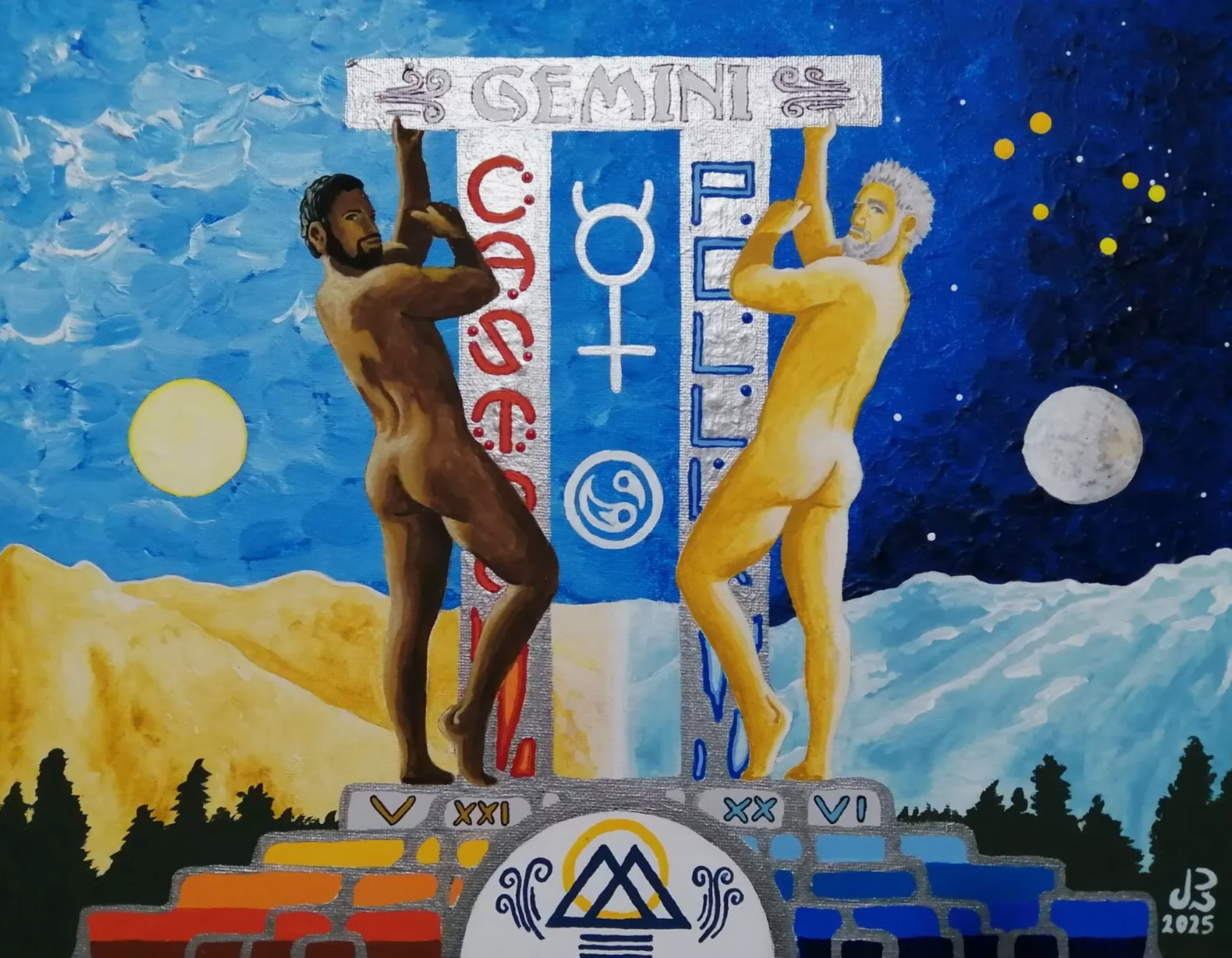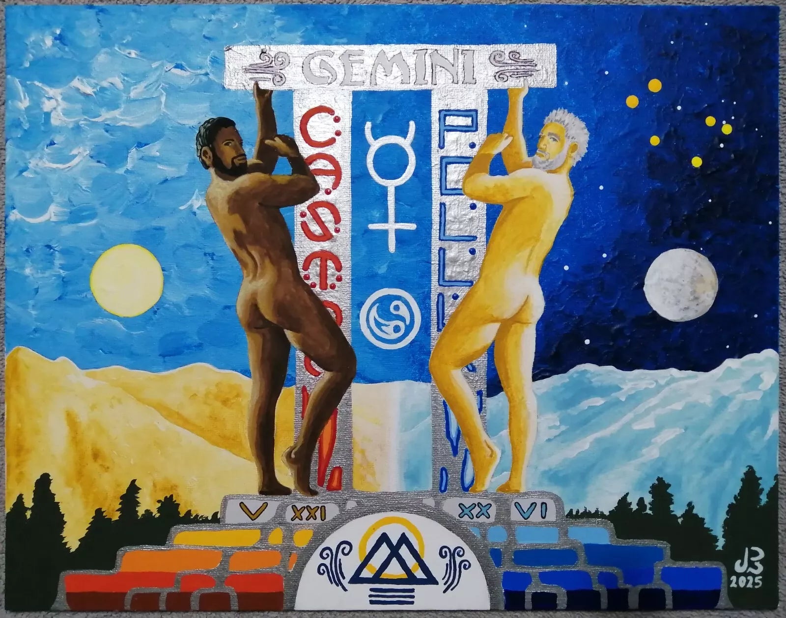 Découvrez "Gémeaux," une œuvre envoûtante qui explore les mystères du signe astrologique des Gémeaux. Deux figures imposantes soutiennent le poids symbolique du destin, entre ciel et terre, jour et nuit. Une fusion de symboles alchimiques et astrologiques crée une toile vibrante et riche en signification. Une pièce unique pour les âmes sensibles et les esprits curieux.