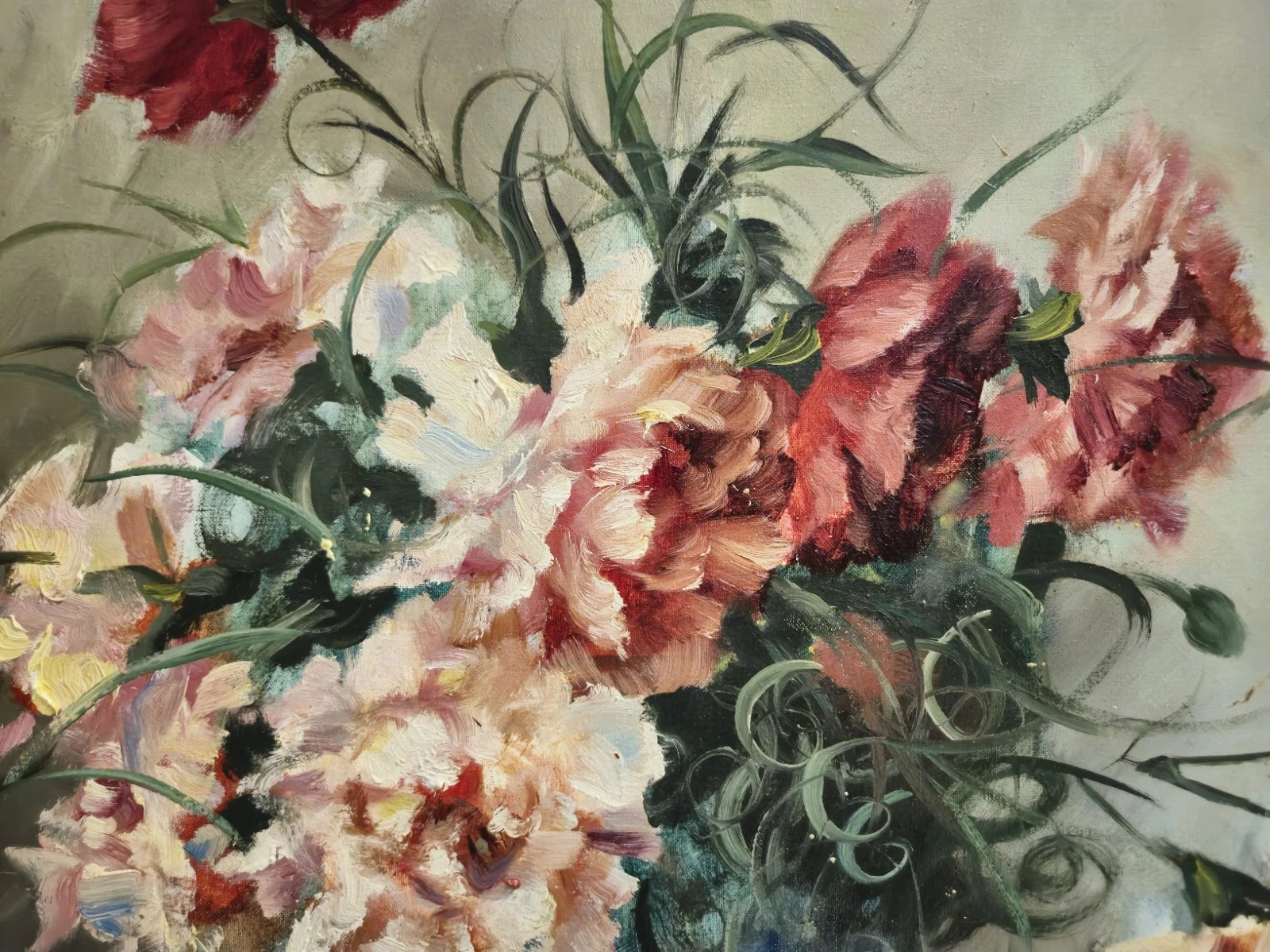 Une œuvre d'art de P. Mertens, un chef-d'œuvre de réalisme et de poésie. Ce magnifique bouquet d'œillets, riche en nuances et en détails, témoigne du talent exceptionnel de l'artiste. Son style impressionniste et ses couleurs vibrantes apportent une touche d'élégance et de raffinement à toute pièce. Une pièce unique pour les amoureux d'art.