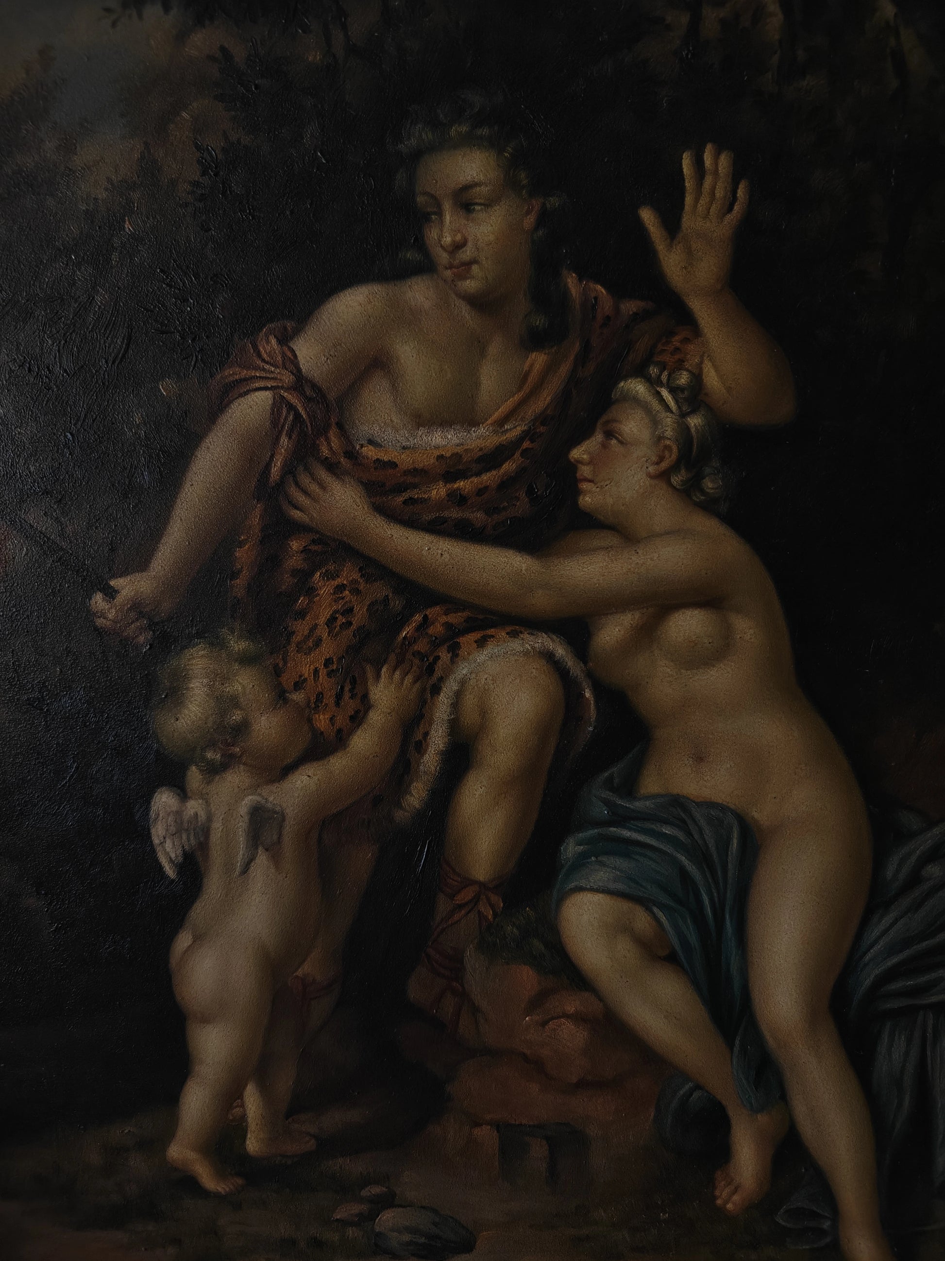 Plongez au cœur d'une scène mythologique captivante avec cette peinture à l'huile saisissante. Un jeune homme drapé d'une peau de félin lève la main, un geste qui évoque autant la protection que la surprise. À ses côtés, une femme d'une beauté classique est enlacée par un chérubin ailé, symbole de l'amour pur et divin.