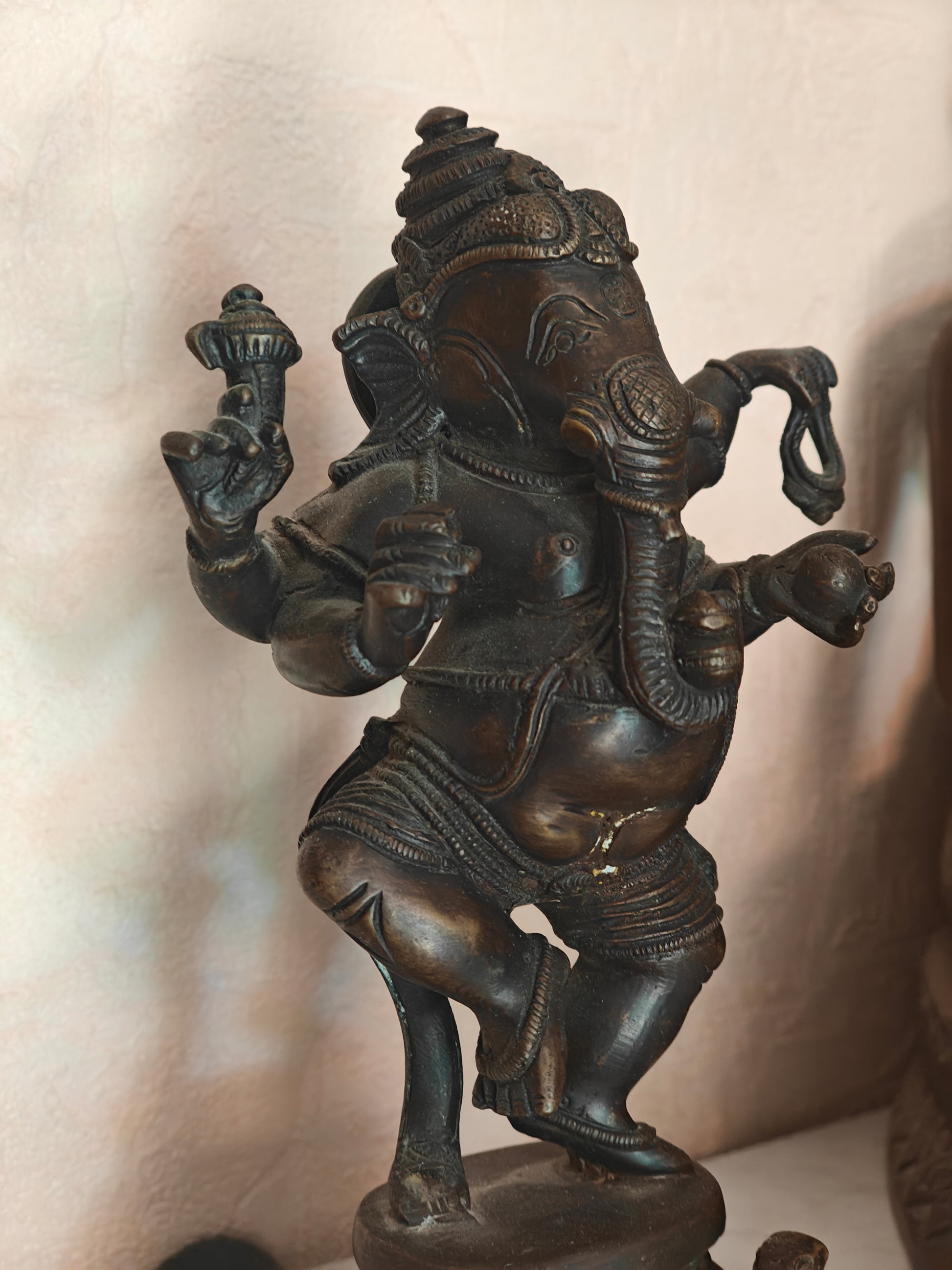 Une œuvre d'art fascinante : statuette de Ganesha en bronze. Cette sculpture exceptionnelle, réalisée dans un bronze patiné, capture la danse joyeuse et énergique de Ganesha. Les détails exquis, le mouvement fluide et la base ornée en font une pièce de collection d'une beauté rare et d'une qualité artisanale exceptionnelle. Un trésor pour les amateurs d'art et d'objets d'exception.