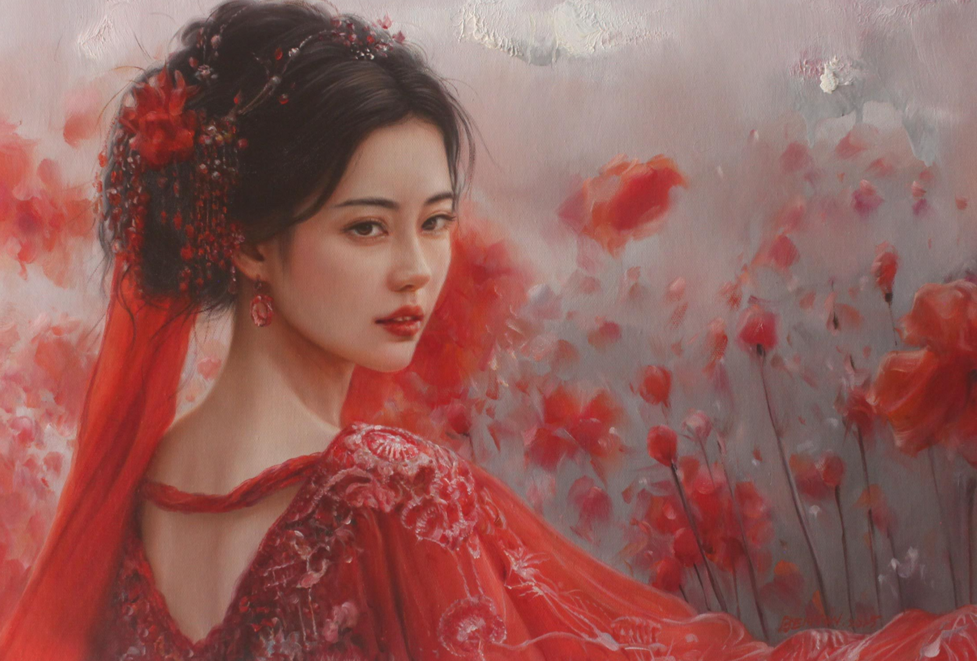 "Captivez votre regard par la grâce et la beauté intemporelle. Cette œuvre d'art, une ode à l'amour et à la féminité, habillera vos murs d'une élégance envoûtante. Le rouge flamboyant, symbole de passion, se marie à la délicatesse des détails, créant une pièce unique et inoubliable."