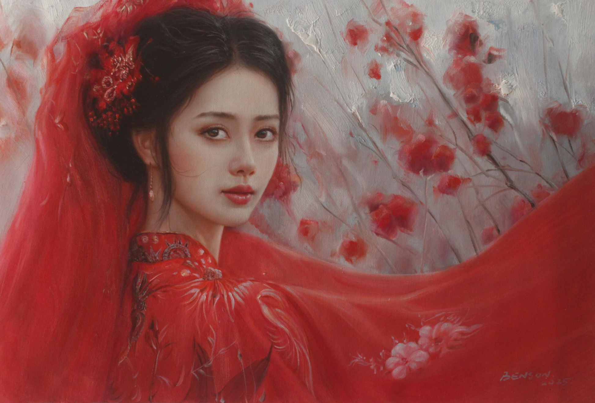 art-decoration-tableau-peinture-huile-toile-portrait-jeune-fille-asiatique-classique-traditionnel-rouge