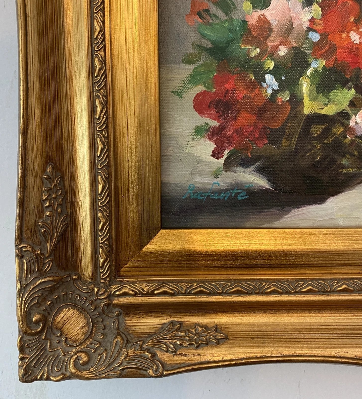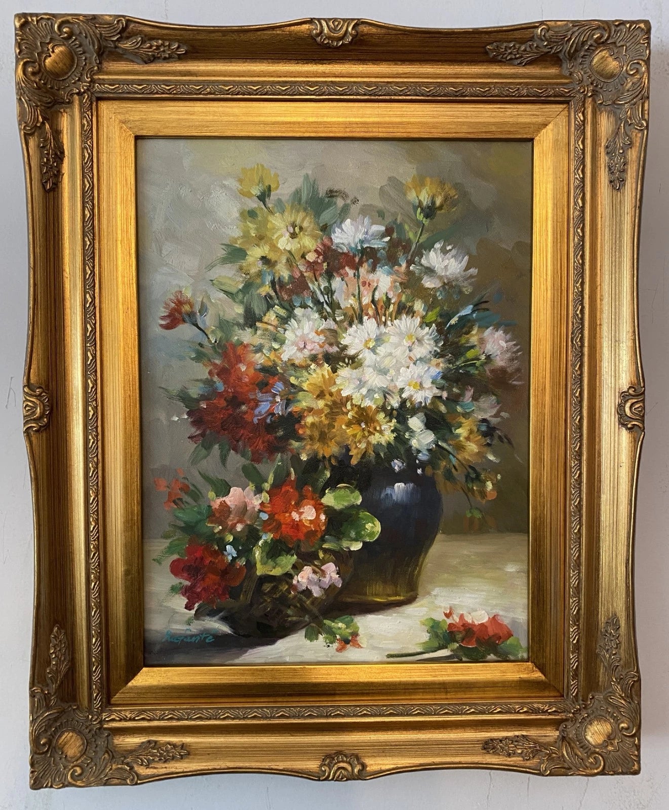 Une huile impressionniste sur toile représentant un magnifique bouquet de fleurs dans un vase posé sur une table. La peinture est bien complétée par le cadre en bois doré orné et est signée par l'artiste. La peinture mesure 12 x 16 pouces- 30x40cm et les dimensions globales, y compris le cadre, sont d'environ 17,5 x 21,5 pouces-45x53cm