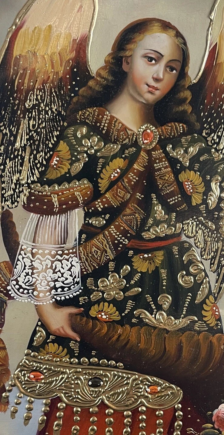 Tableau huile original école St Gabriel Archange Cusco-Cusco School Peru Original Oil Painting of Gabriel the archangel
